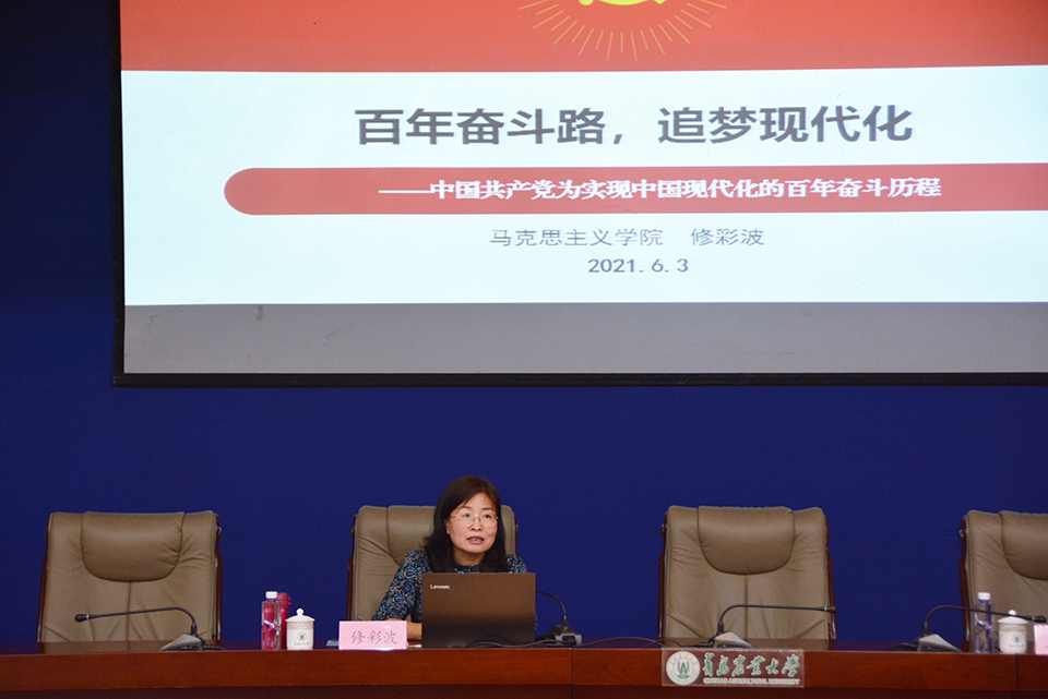 本次讲座由马克思主义学院修彩波教授主讲,她从“敢问路在何方”、“不走‘老路’和‘邪路’”、“走有中国特色的‘新路’”三个方面作了《百年奋斗路,追梦现代化——中国共产党为实现中国现代化的百年奋斗历程》主题报告,报告详细阐述了中国共产党的百年奋斗历程,深刻阐明了中国特色社会主义是历史发展的必然结果、中国特色社会主义道路是实现中华民族伟大复兴的必由之路。