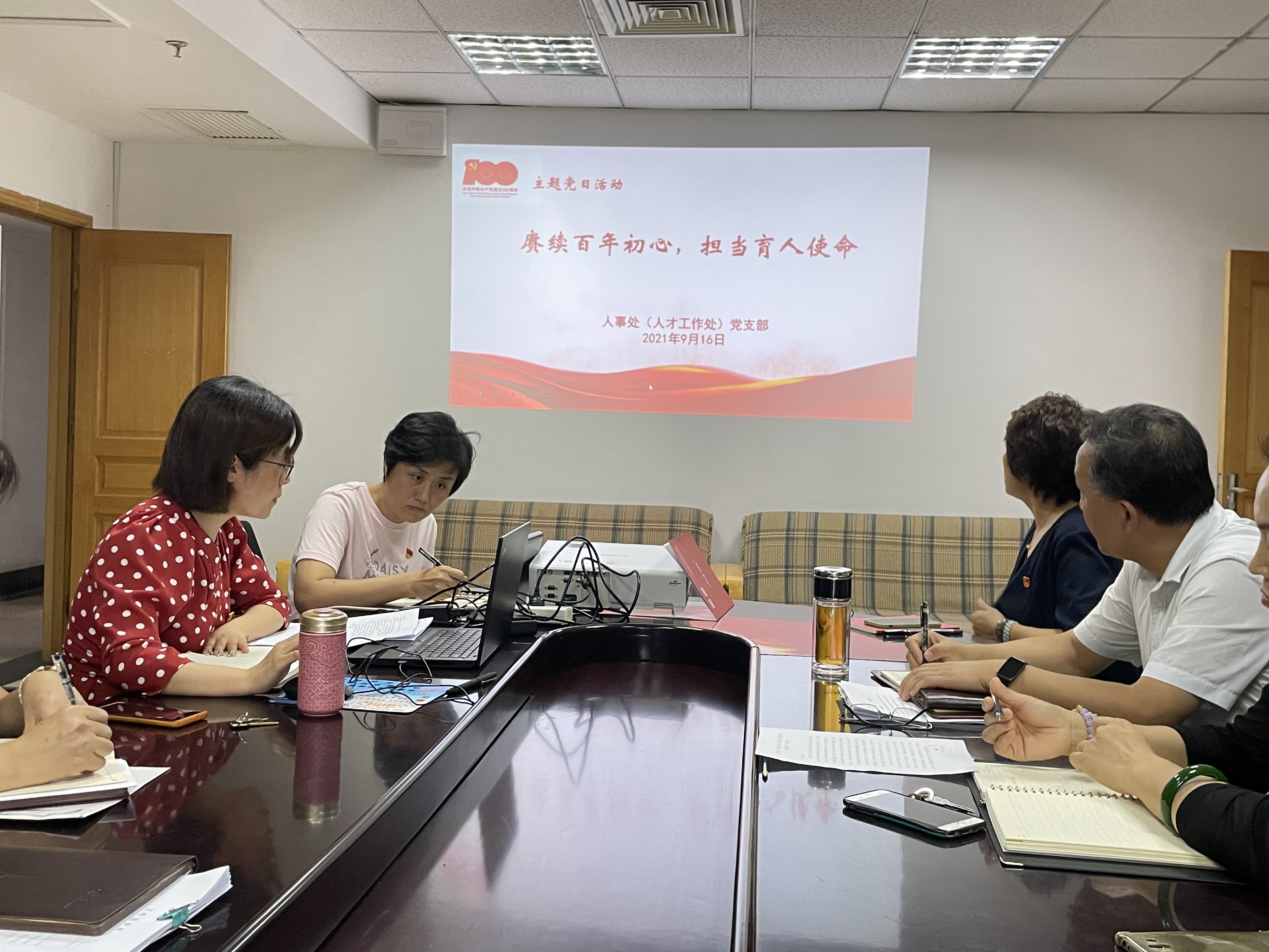 9月16日下午,yl8cc永利官网(人才工作处)党支部开展“赓续百年初心 担当育人使命”主题党日活动,校党委委员、副校长刘春霞以普通党员身份参加活动,yl8cc永利官网(人才工作处)处长郑丹、处长助理常桂娟列席,全体党员参加。