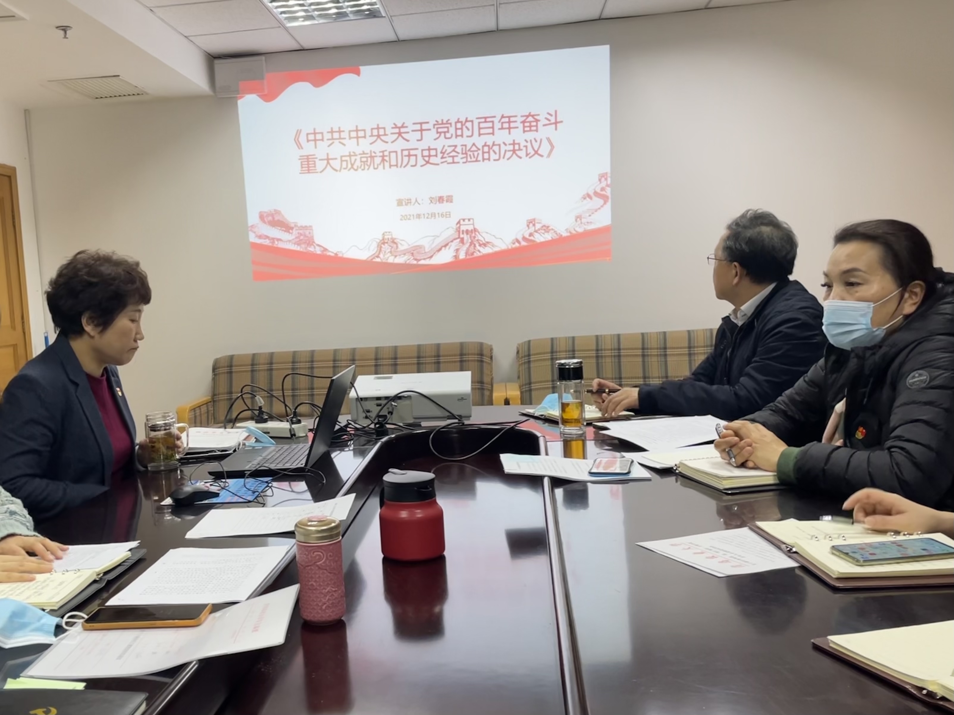 2021年12月16日下午,校党委委员、副校长刘春霞为yl8cc永利官网(人才工作处)宣讲党的十九届六中全会精神,全体党员参加。