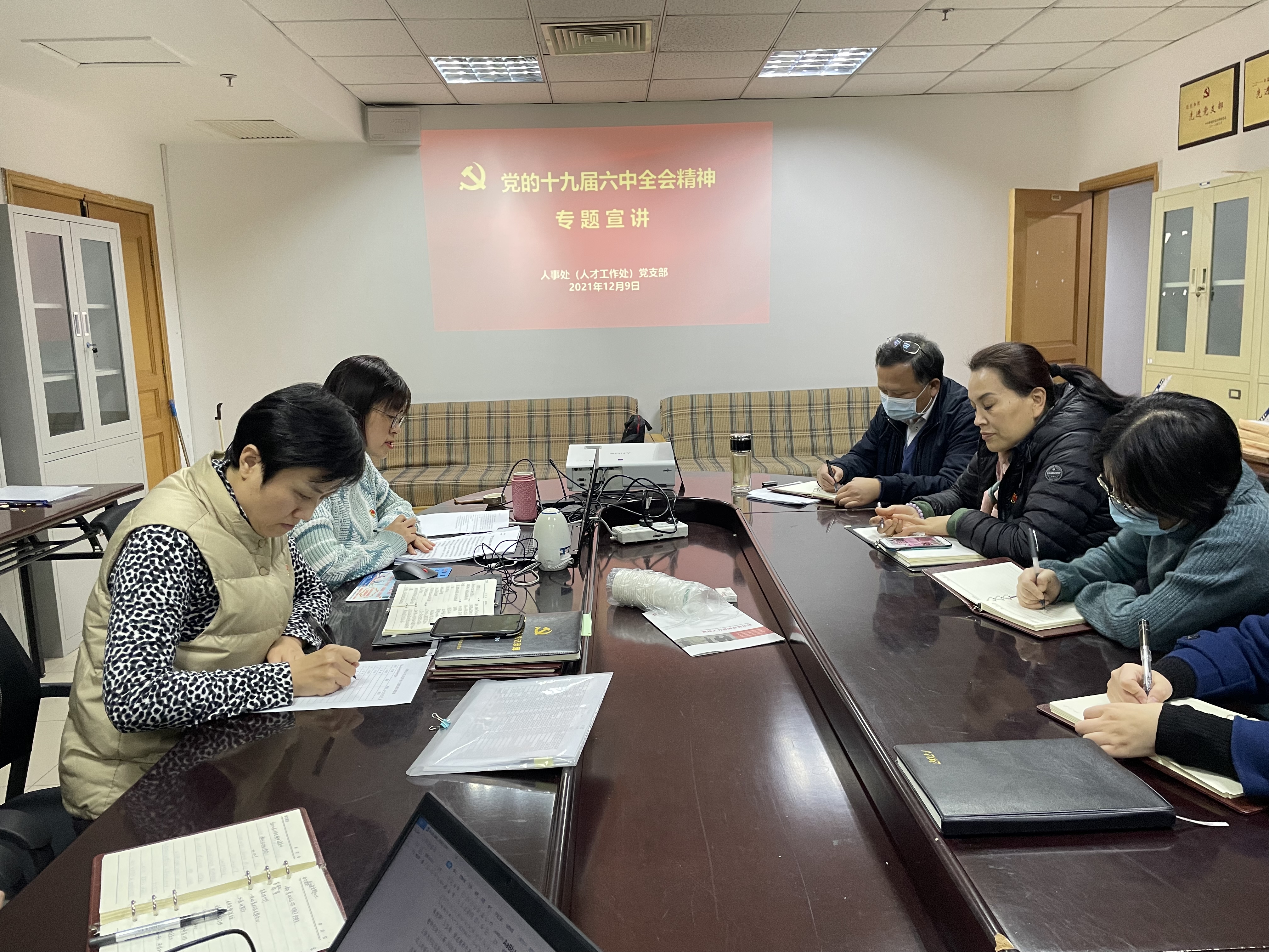 2021年12月9日下午,yl8cc永利官网(人才工作处)党支部开展党的十九届六中全会精神宣讲,全体党员参加。